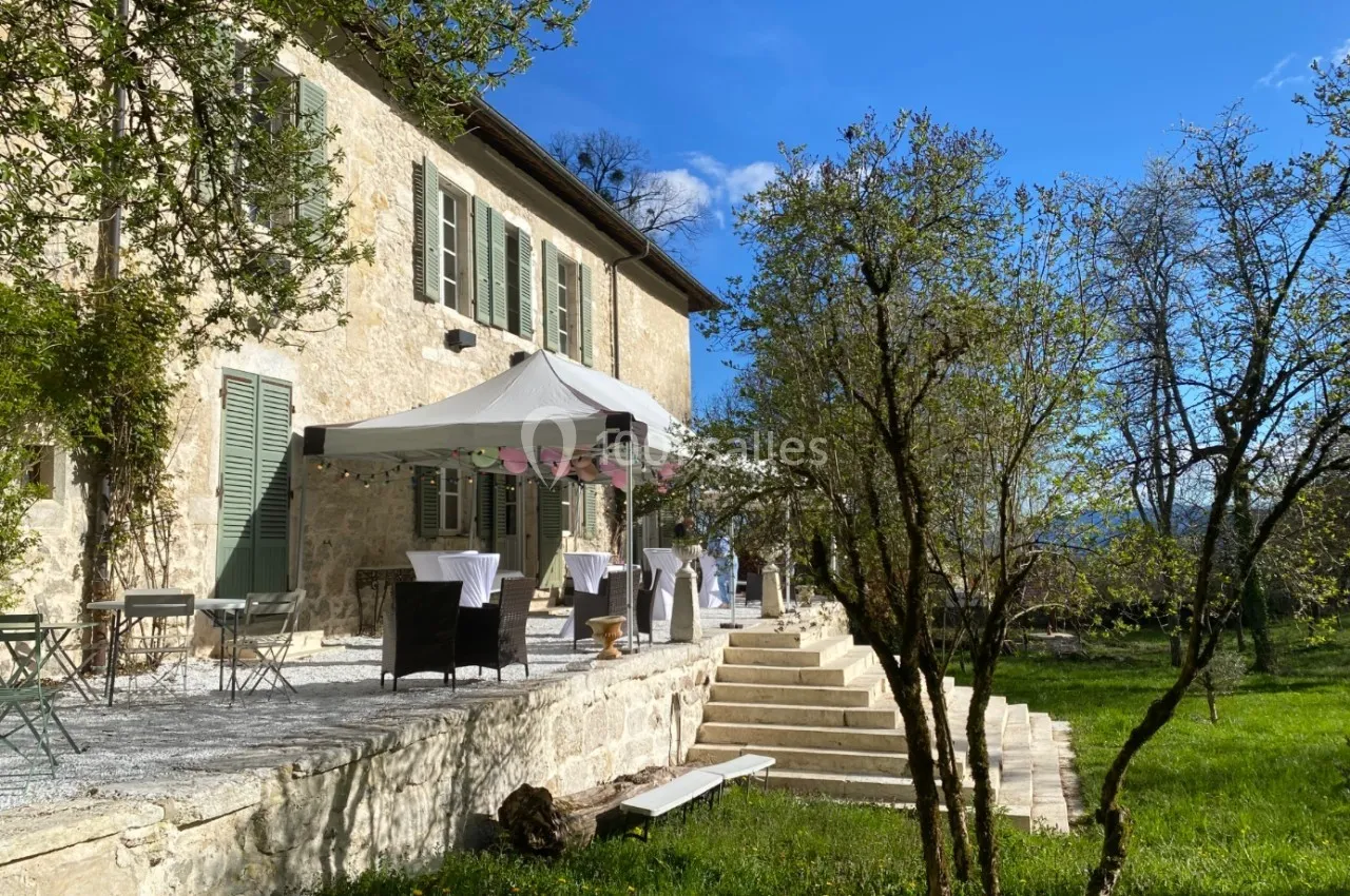 La terrasse offre un espace privilégié pour le verre ou le vin d'honneur, cocktail dînatoire ainsi que son escalier majestueux, idéal pour les photos de famille ou de groupes, sur ses marches. La vue depuis la terrasse donne sur la piscine et son parc de 3,6 hectares avec hébergements supplémentaires possible en option (lodges).
