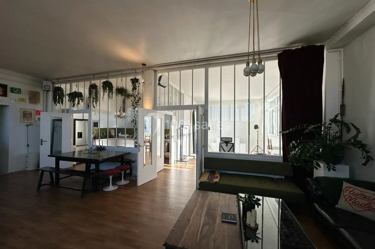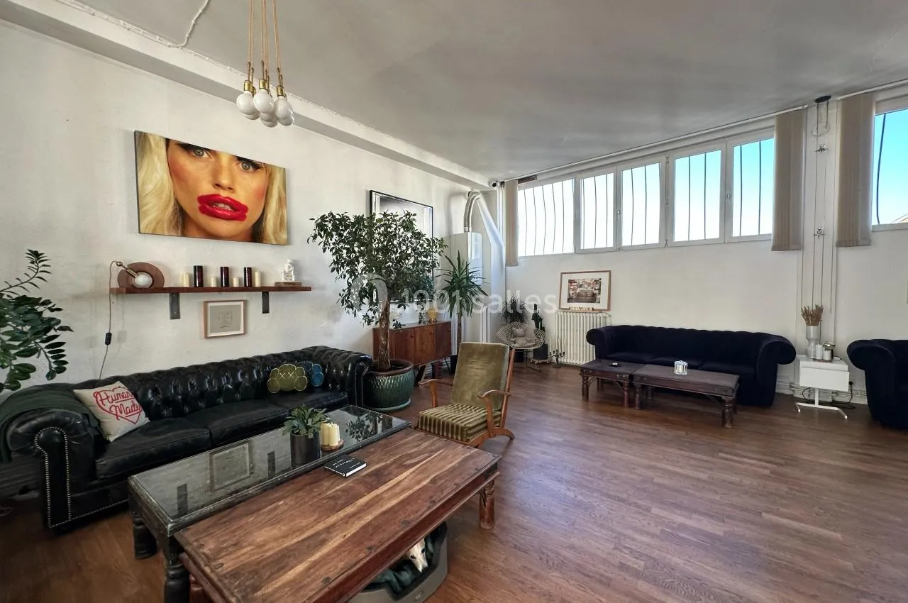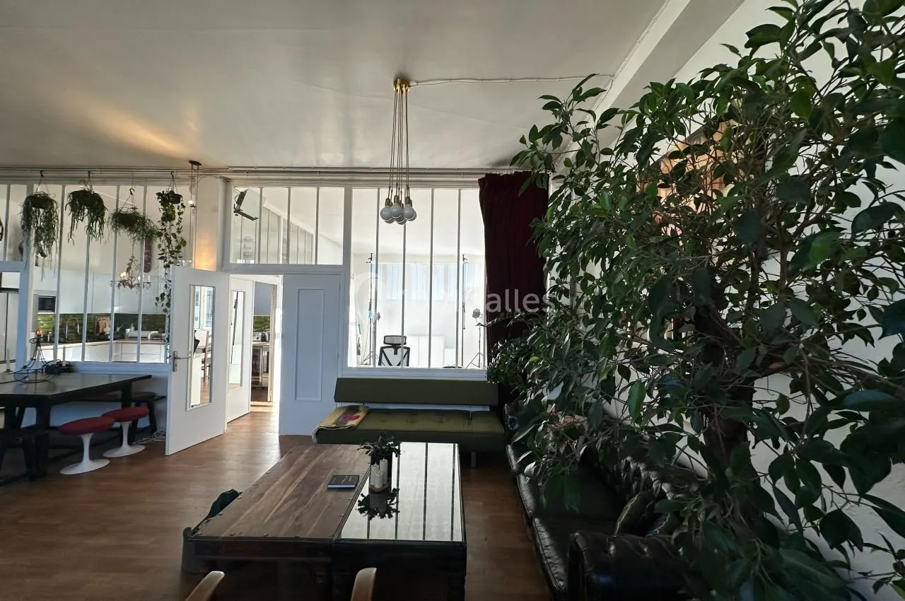 La grande pièce de vie combine salle à manger et salon, avec une hauteur sous plafond de 3,40 m et des fenêtres tout le long du mur (9 mètres de vitres) offrant une vue imprenable sur le ciel. Exposée sud-ouest, cette pièce bénéf...icie de la lumière naturelle tout au long de la journée, créant une ambiance chaleureuse et accueillante, avec un éclairage naturel magique au coucher du soleil. L’atmosphère est cosy et élégante, avec 4 canapés, des tables basses, une table à manger et des bancs. Un grand miroir ancien sur un des murs reflète la lumière et double l’espace. Des œuvres d’art décorent les murs, tandis que des plantes, dont un magnifique ficus géant et des plantes suspendues, ajoutent de la vie. Le parquet en bois naturel d’origine recouvre toute la surface. Le tout crée un lieu à la fois élégant et confortable, propice à des moments inoubliables.