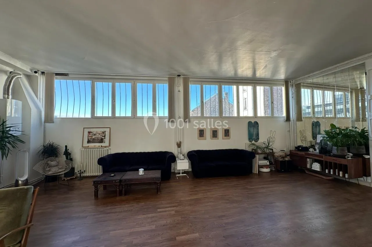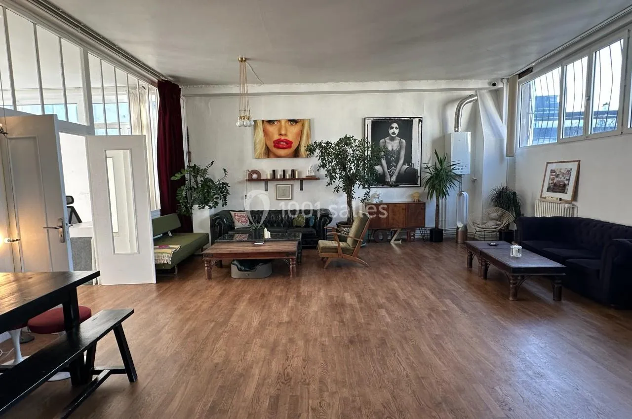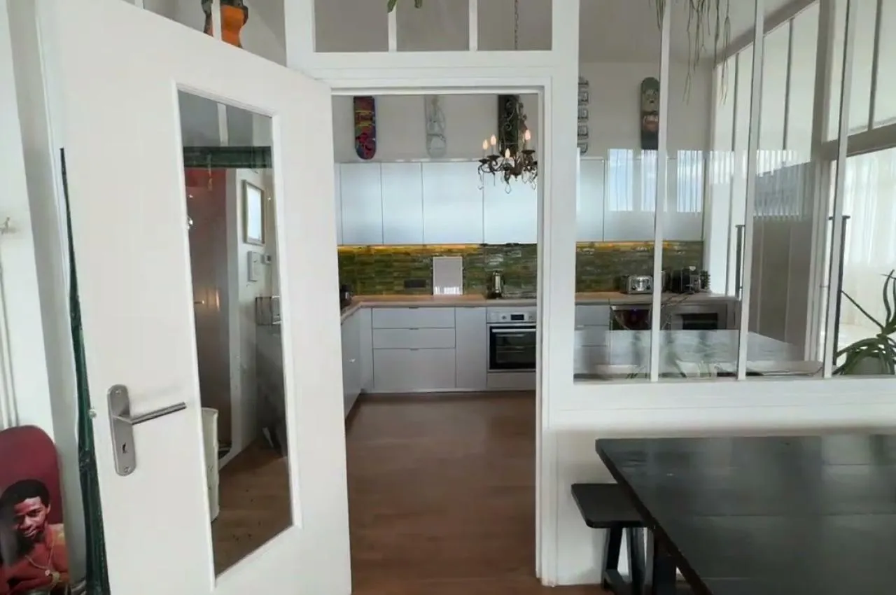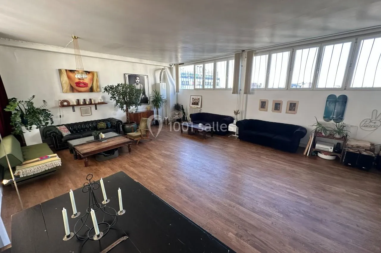 La grande pièce de vie combine salle à manger et salon, avec une hauteur sous plafond de 3,40 m et des fenêtres tout le long du mur (9 mètres de vitres) offrant une vue imprenable sur le ciel. Exposée sud-ouest, cette pièce bénéf...icie de la lumière naturelle tout au long de la journée, créant une ambiance chaleureuse et accueillante, avec un éclairage naturel magique au coucher du soleil. L’atmosphère est cosy et élégante, avec 4 canapés, des tables basses, une table à manger et des bancs. Un grand miroir ancien sur un des murs reflète la lumière et double l’espace. Des œuvres d’art décorent les murs, tandis que des plantes, dont un magnifique ficus géant et des plantes suspendues, ajoutent de la vie. Le parquet en bois naturel d’origine recouvre toute la surface. Le tout crée un lieu à la fois élégant et confortable, propice à des moments inoubliables.