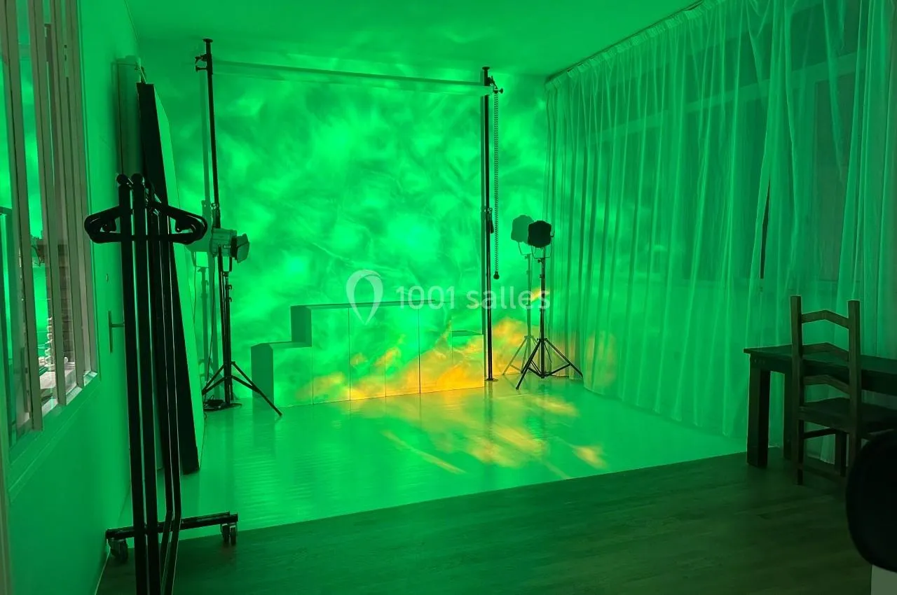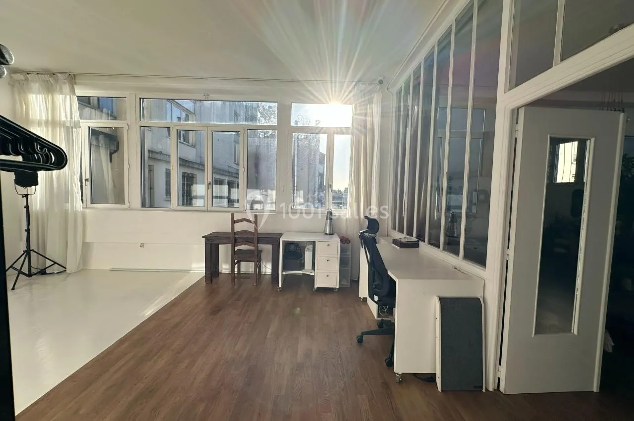 Le studio photo, aussi bien conçu pour des séances photo que pour un espace de détente, de création ou pour y dresser une belle table, bénéficie également de l’exposition plein soleil toute la journée, des fenêtres tout le long du mur (6 mètres de vitres) avec une hauteur sous plafond de 3,40 m. Le parquet semi-peint en blanc et la partie en bois naturel lui confèrent une ambiance à la fois lumineuse et apaisante. Idéal pour des événements créatifs ou pour ceux qui souhaitent profiter d’une belle lumière naturelle. Toute la zone du lieu bénéficie de cette luminosité exceptionnelle, même lors de journées pluvieuses.
