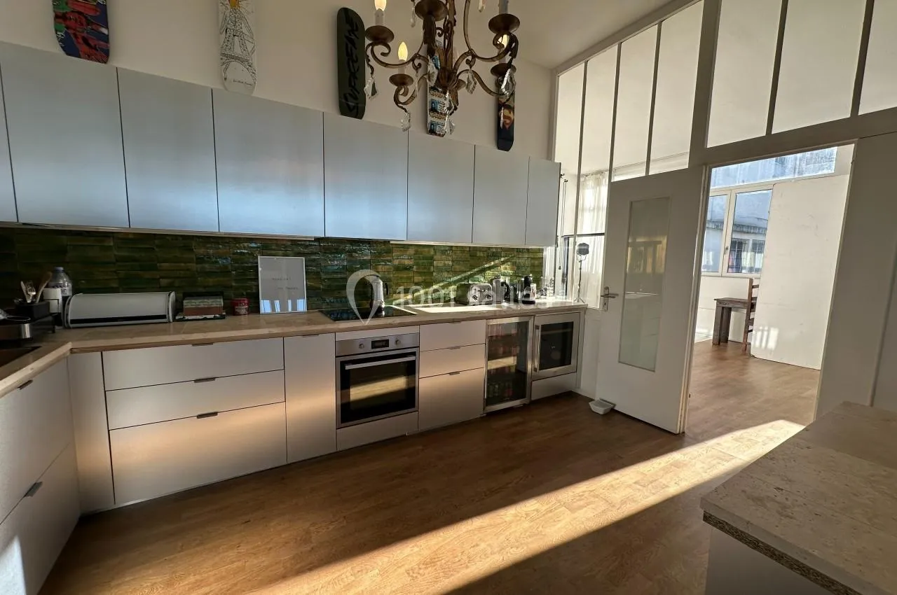 La cuisine a été entièrement refaite avec un design moderne et chaleureux. Elle mesure 15 m² et bénéficie d’une luminosité exceptionnelle grâce à ses verrières et son exposition sud-est. Le ...plan de travail en travertin est éclairé par des éclairages LED, mettant en valeur la beauté des matériaux, notamment les zelliges verts du Maroc et les placards métalliques. Une deuxième zone, un comptoir en face, est parfaite pour la mise en place des plats ou pour disposer de boissons. La cuisine est conçue pour accueillir un chef, avec un espace suffisant pour la préparation des repas. Le plafond de 3,40 m de hauteur et les grandes verrières ouvertes sur la grande pièce de vie et le solarium ajoutent à la sensation d’espace et de lumière.