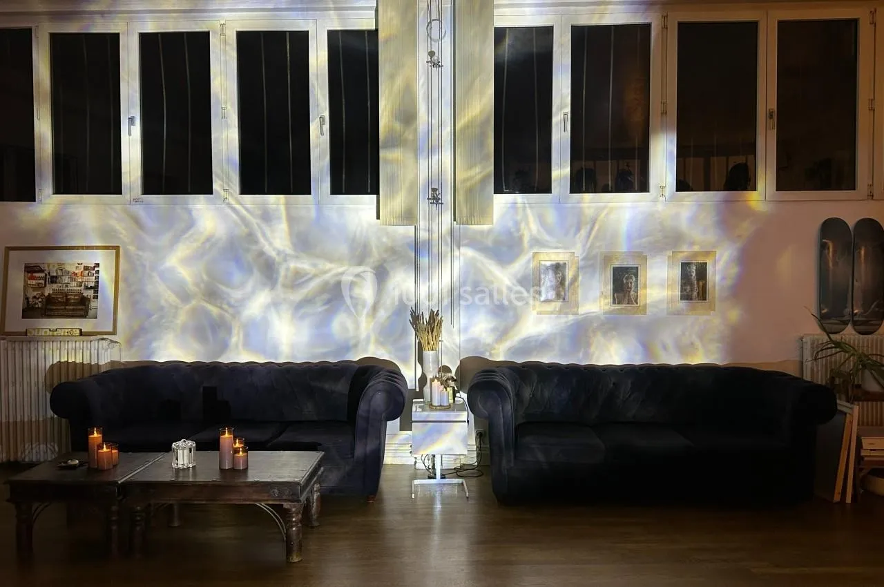 Le coin canapé permet à ceux qui le souhaitent de s’installer confortablement pour discuter, tout en restant connectés à l’ambiance festive de la soirée. Grâce à la disposition du lieu, il est possible de moduler les ambiances sonores : musique douce côté séjour, plus rythmée dans le studio — ou l’inverse. Tout est pensé pour que chaque invité trouve sa place.