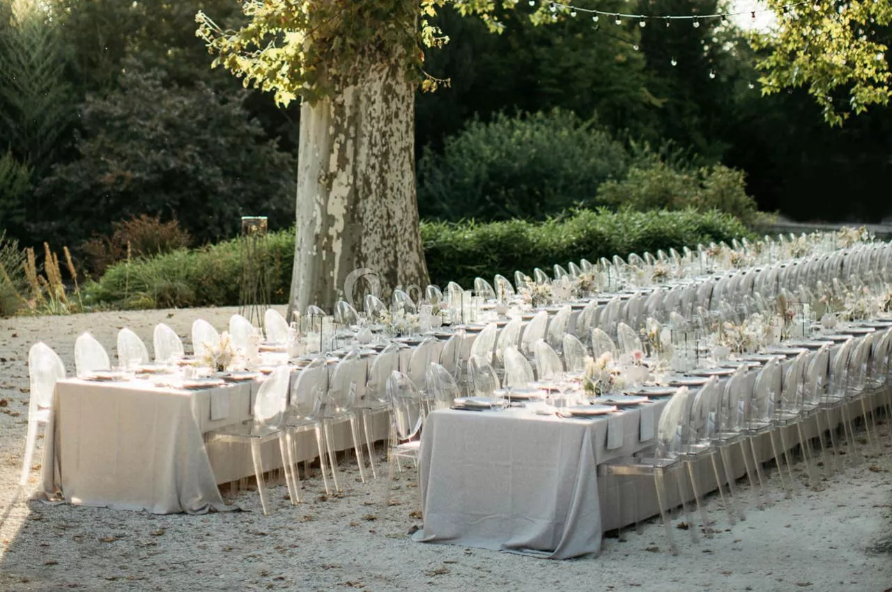 Tout a été pensé pour une journée exceptionnelle, avec la possibilité d'organiser chaque moment dans des endroits uniques et poétiques : la cérémonie près d'un étang apaisant, le cocktail dans les magnifiques jardins frontaliers de l'édifice principal, et un dîner sous une tente nomade située dans la cour. La soirée dansante s'est déroulée dans la spacieuse salle de réception du Domaine de Blacons.