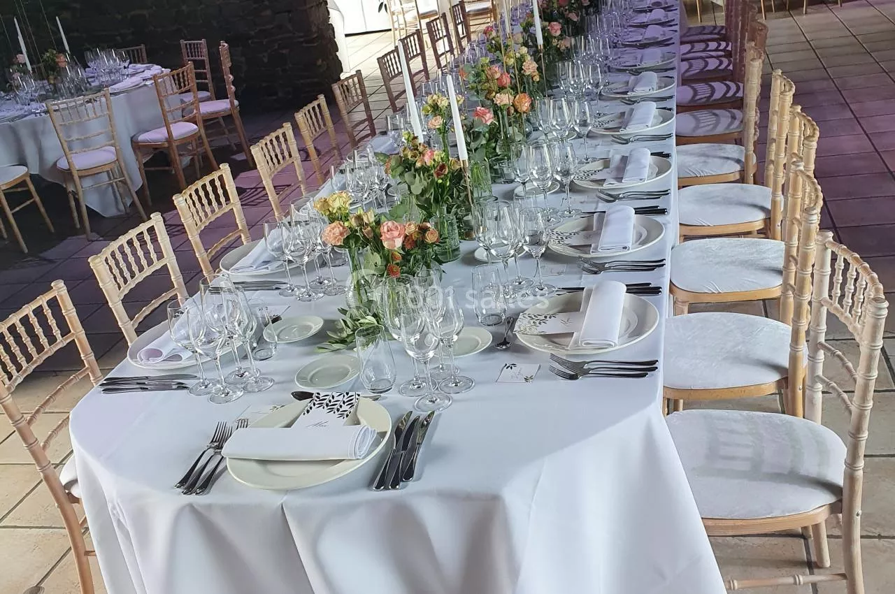 La location comprend une de nos grandes salles , avec les tables , les chaises avec housses , les manges-debout , le mobilier de jardin ( salon ) les énergies ( eau , chauffage , électricité) , l'accès la veille pour les préparatifs .