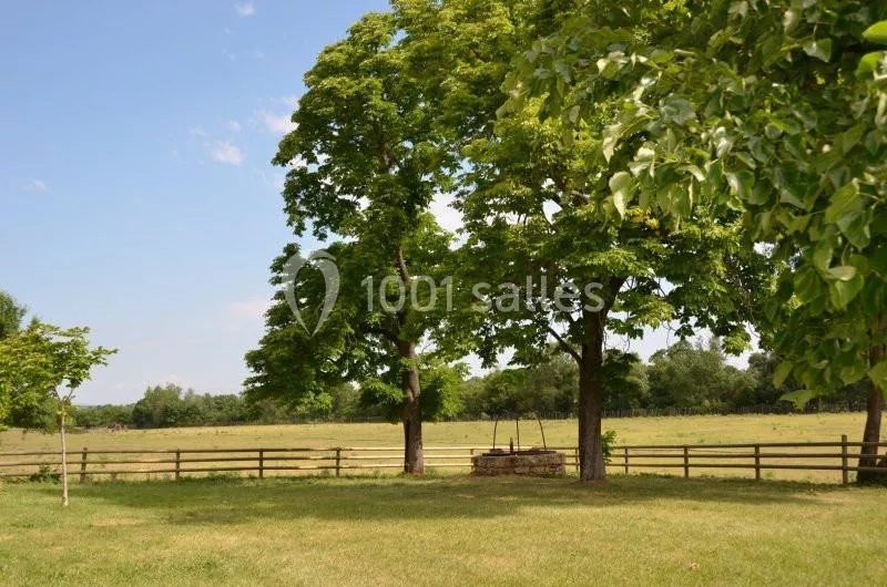 La location inclut un espace traiteur, un parking, des tables et chaises, un forfait ménage, et un espace pelousé avec un ancien puits.