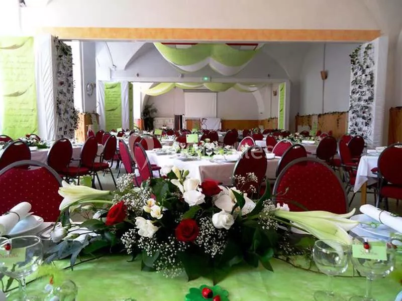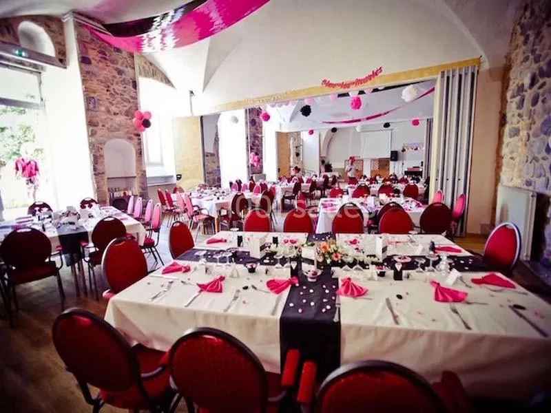 Les salles, comme la salle des fêtes avec pierres apparentes et plancher chêne, offrent une ambiance unique et chaleureuse.