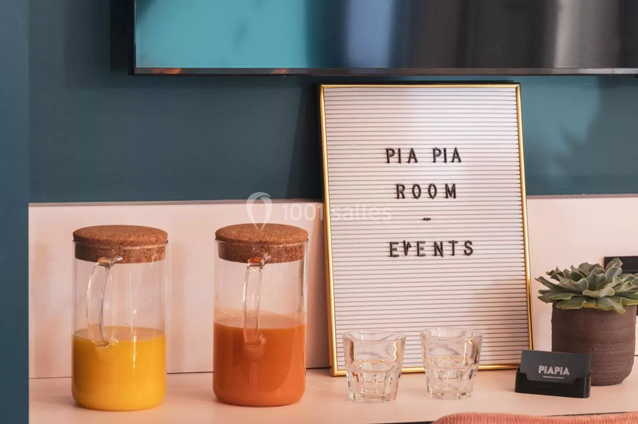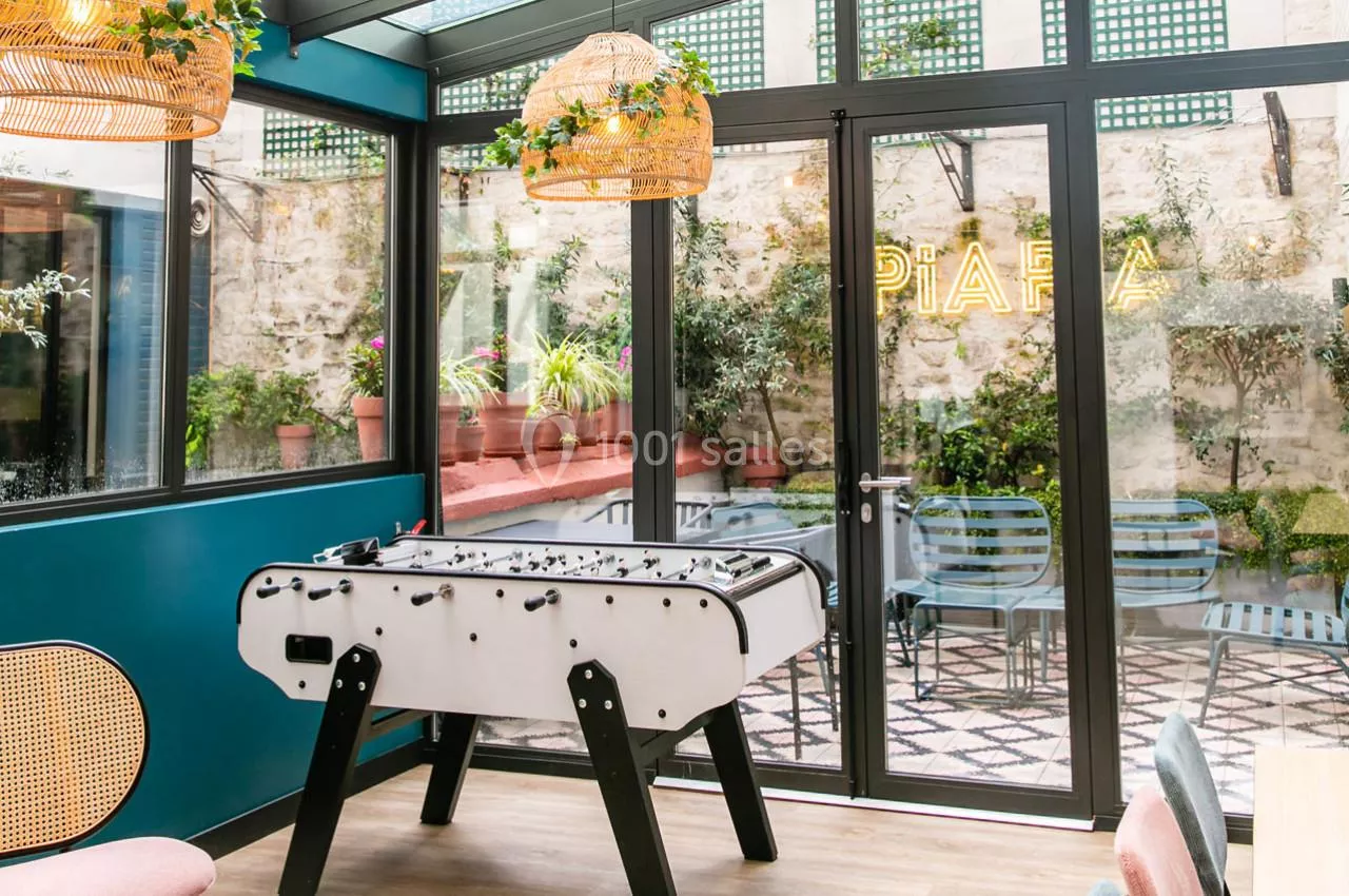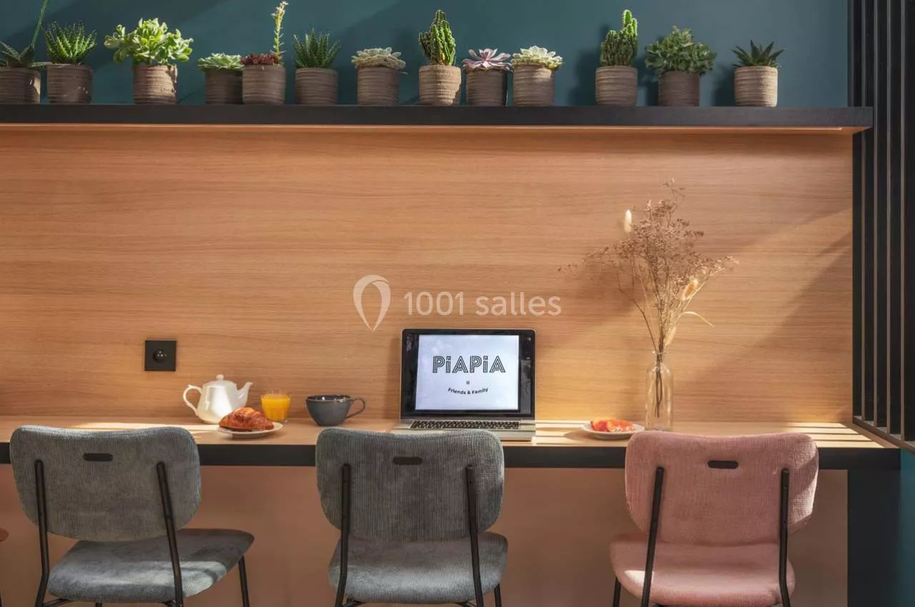 Pour les moments de détente et de convivialité, vous trouverez un babyfoot, une collection riche en jeux de société pour tous les goûts, et une terrasse accueillante, parfaite pour prendre l'air ou pour des pauses café ensoleillées. Nous offrons également un accès illimité à une sélection de boissons chaudes pour vous garder énergisé tout au long de la journée. Et pour vos déjeuners d'affaires ou vos pauses gourmandes, nous pouvons organiser un service traiteur, vous proposant une gamme variée de délicieux repas pour satisfaire tous les palais. La PiaPia Room promet une expérience sans pareil, où travail et plaisir se rencontrent dans un cadre inspirant et convivial.