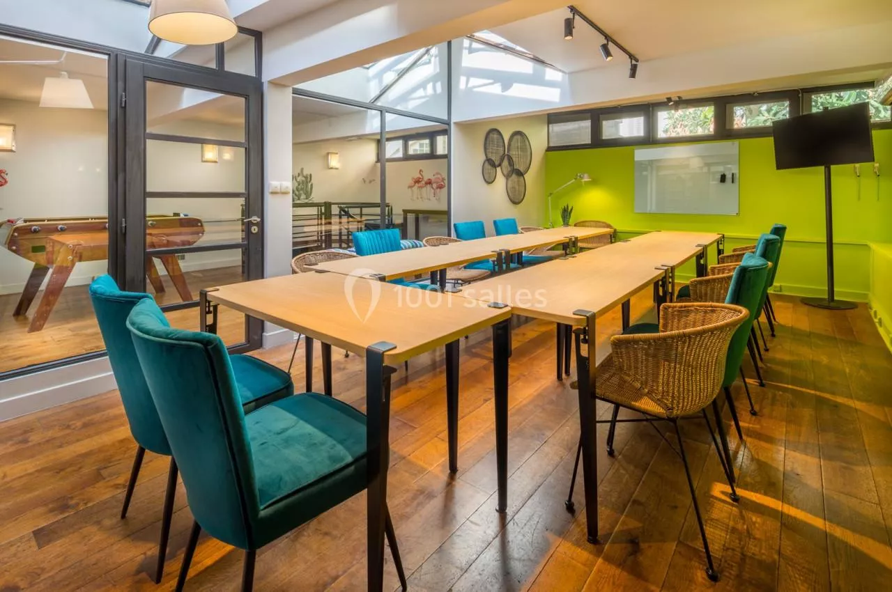 La pièce principale de l'Atelier est le loft qui a une surface de presque 300 m2 d'emprise au sol, cet espace peut aussi bien servir de plénière que de cocktail debout ou encore d'activité team building. L'Atelier est doté de plusieurs salles de sous... commissions : le billard, le cosy vert et le cosy rose qui peuvent chacune accueillir une dizaine de participants. De plus, le bistro peut être utilisé comme espace de restauration, en effet il peut accueillir jusqu'à 60 personnes assises mais aussi comme une salle de sous-commission pouvant être scindée en 3 espaces pour y organiser des ateliers de travail.