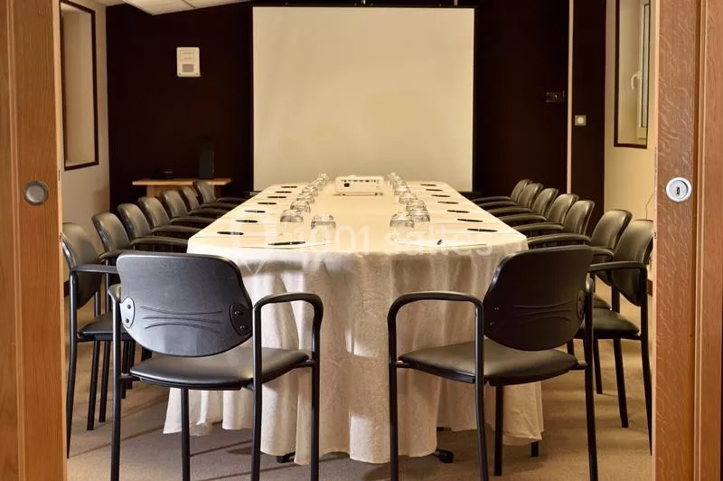 Salle de réunion avec matériel standard (Bloc-note, stylo, eau plate, vidéoprojecteur, écran, paperboard et ordinateur).