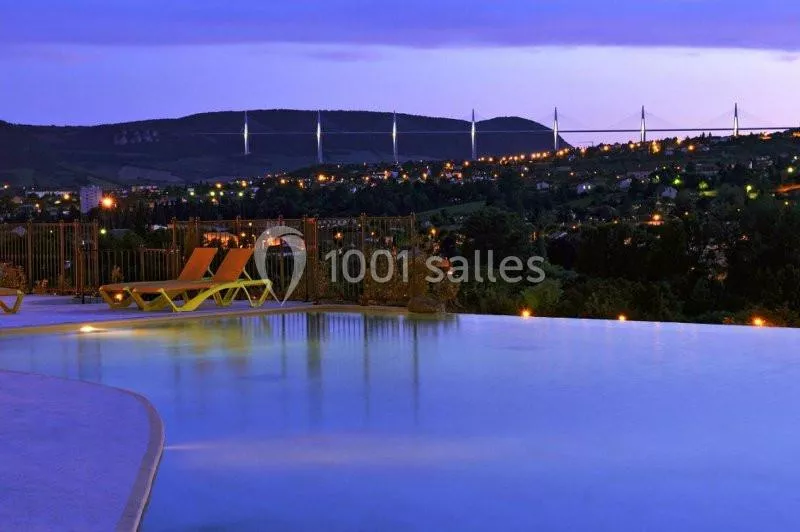 La piscine à débordement (chauffée) surplombant la ville de Millau et son bar extérieur avec l'une des plus belles vues sur le Viaduc de Millau.
