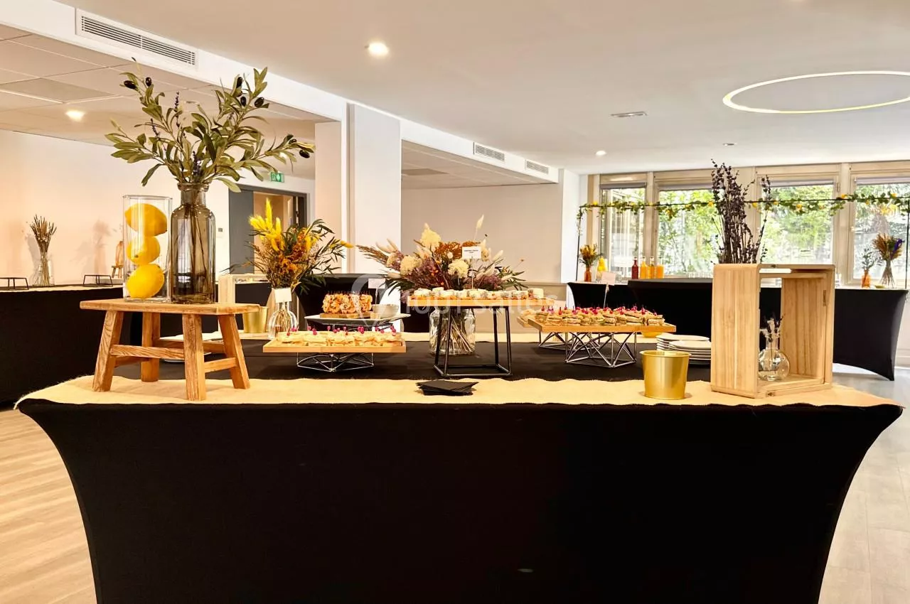 Nous organisons vos petit déjeuners, déjeuners ou dîners sur place dans la salle cocktail de 250 m², sous forme de cocktails, de buffets ou de repas assis jusqu'à 150 personnes.