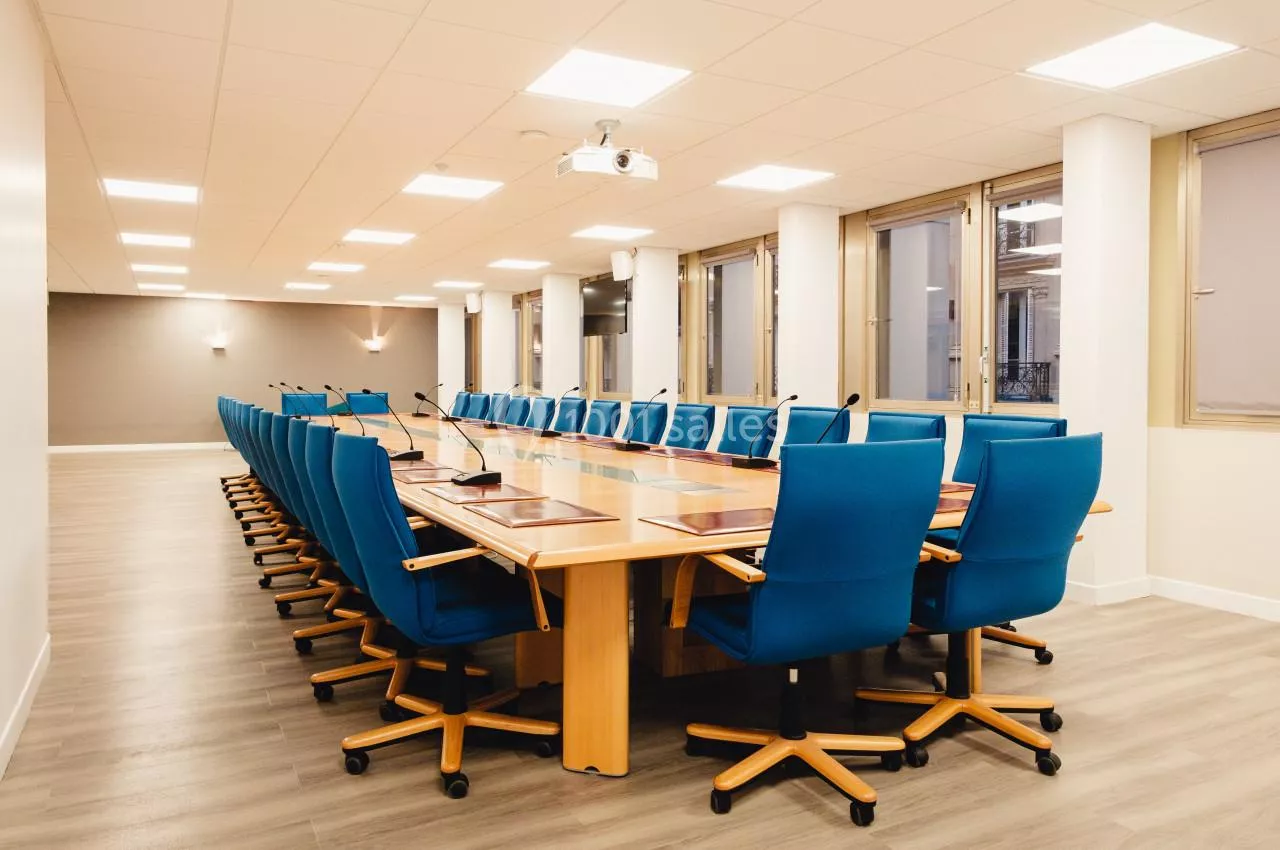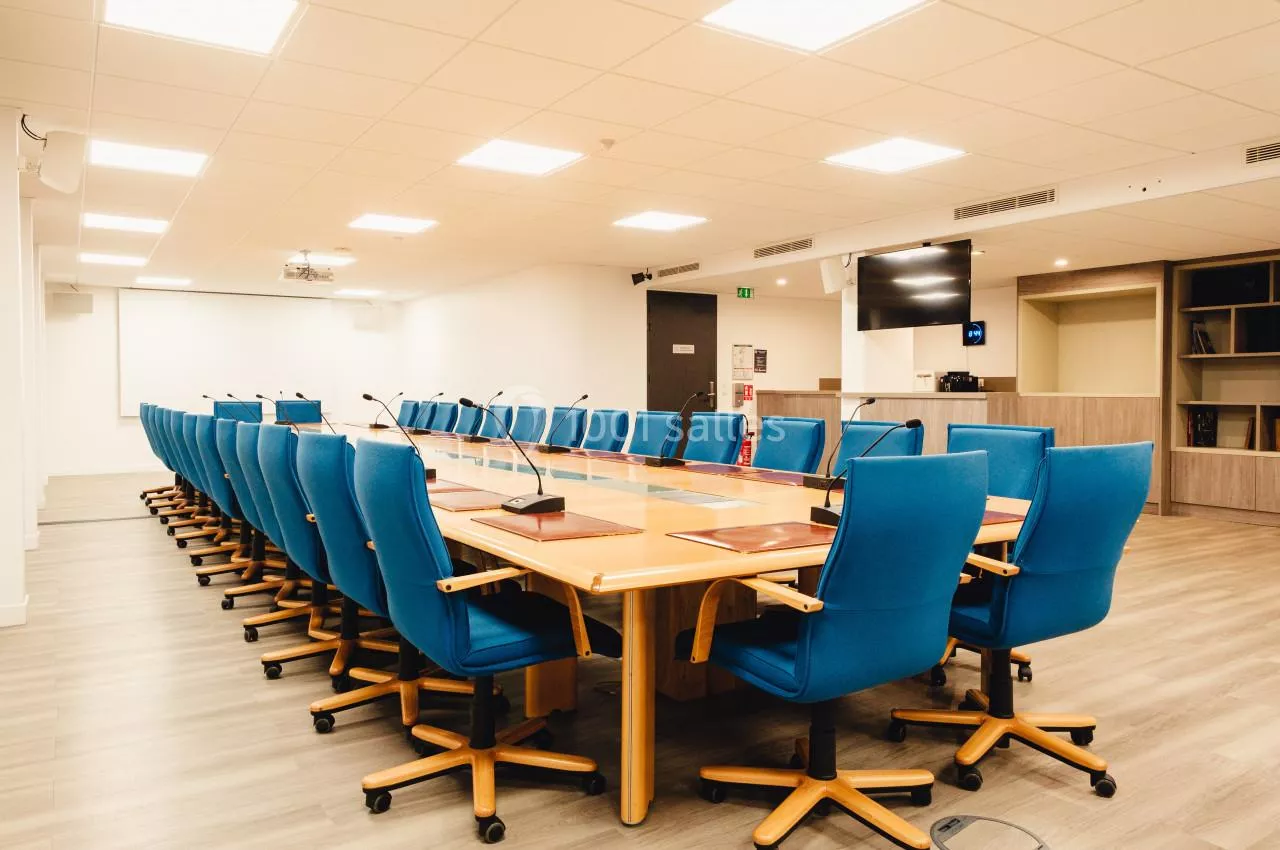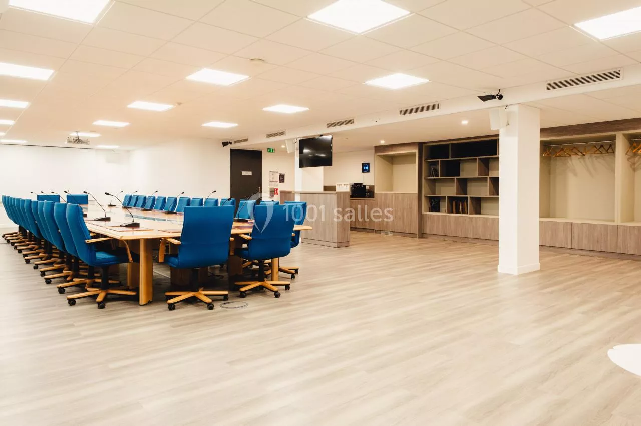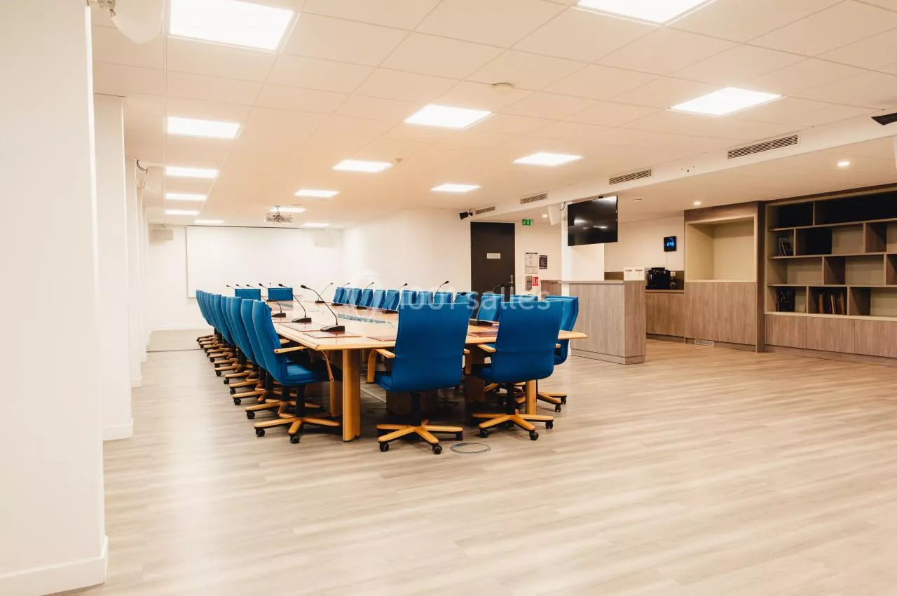 - Une grande salle de réunion de 30 places assises située au 3ème étage du bâtiment. Très lumineuse cette salle dispose de tout le matériel nécessaire au bon déroulement de votre réunion en présentiel ou a distanciel : visio conférence, vidéo projecteur, micro col de cygne.