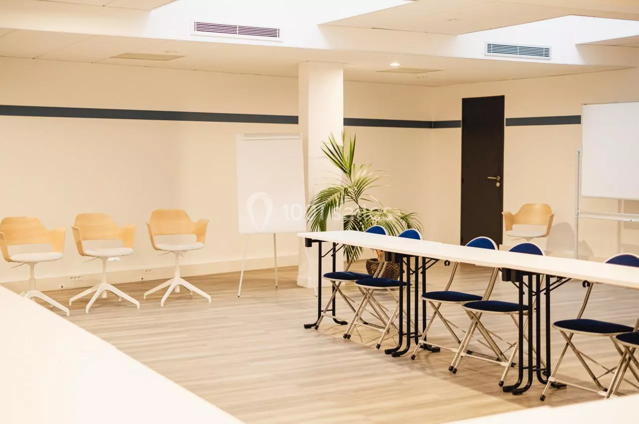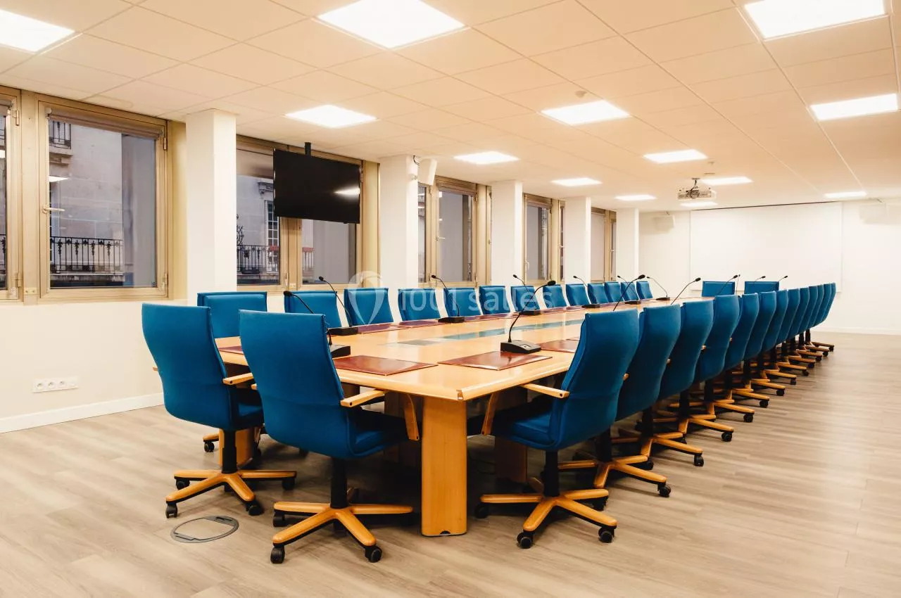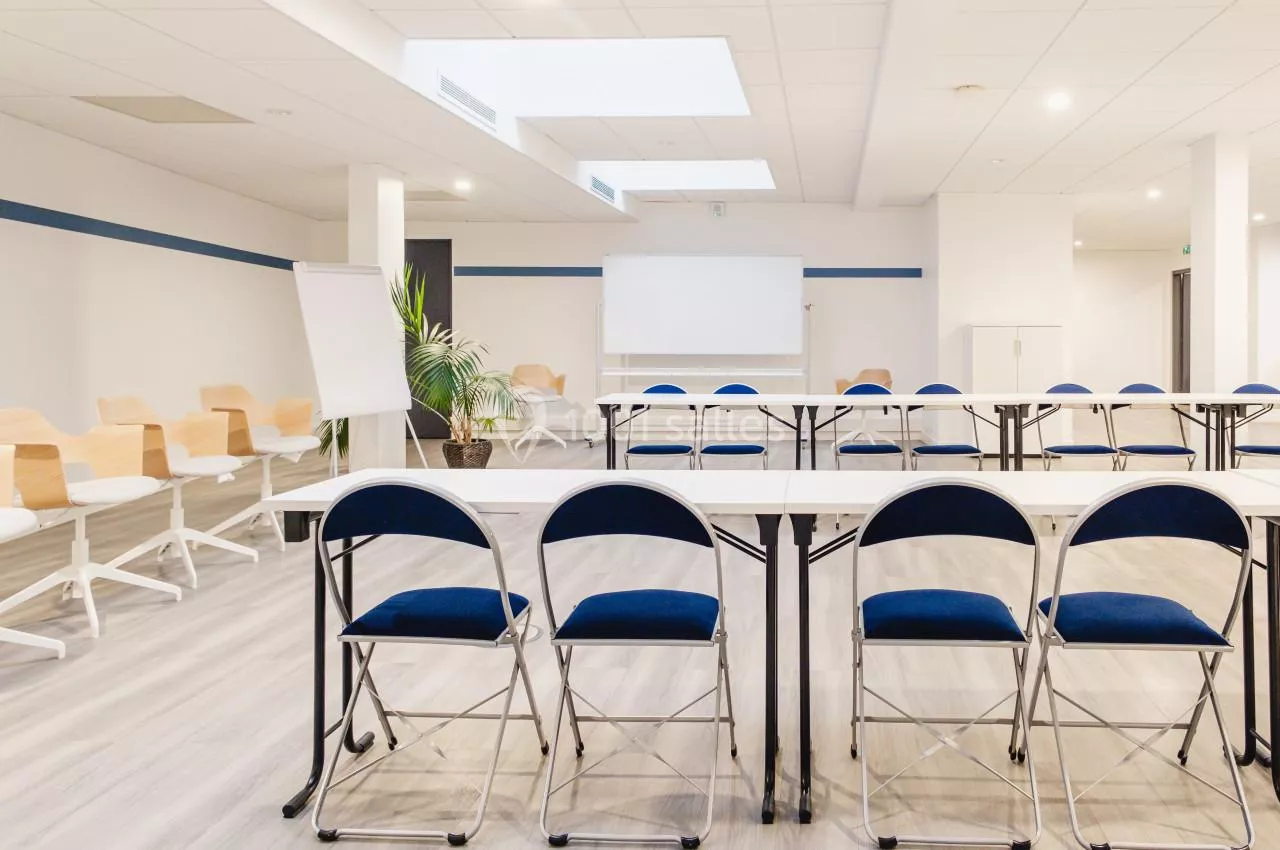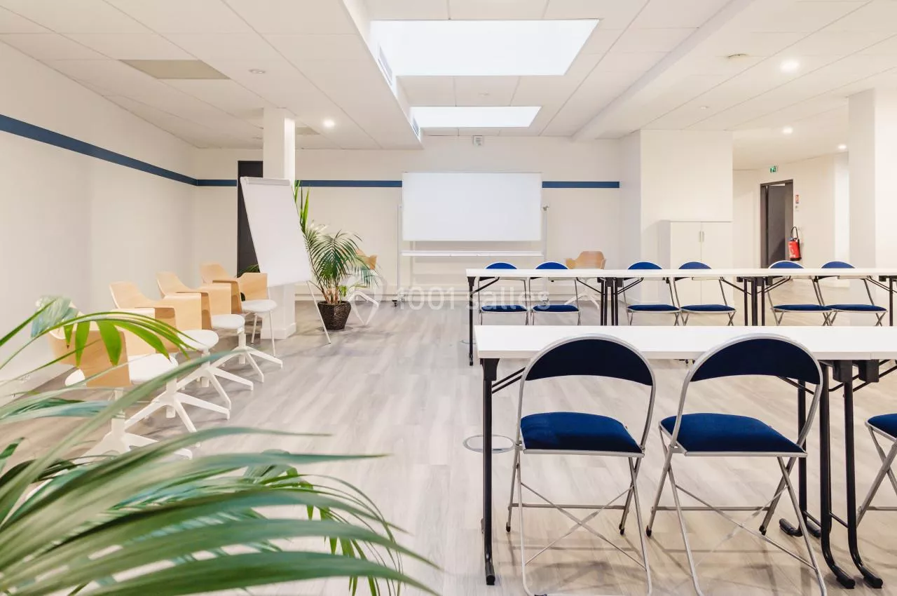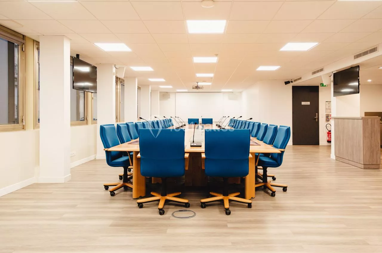 - Une grande salle de réunion de 30 places assises située au 3ème étage du bâtiment. Très lumineuse cette salle dispose de tout le matériel nécessaire au bon déroulement de votre réunion en présentiel ou a distanciel : visio conférence, vidéo projecteur, micro col de cygne.