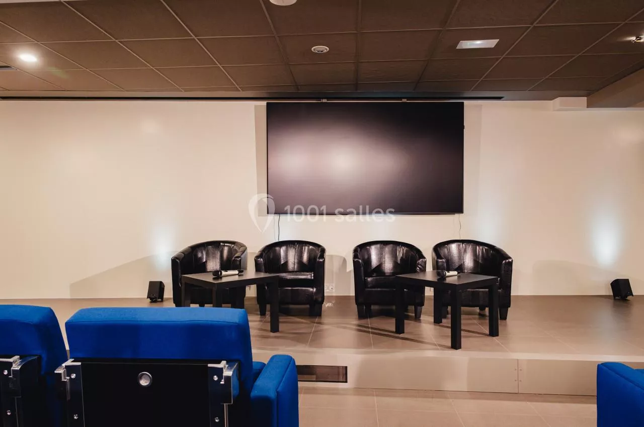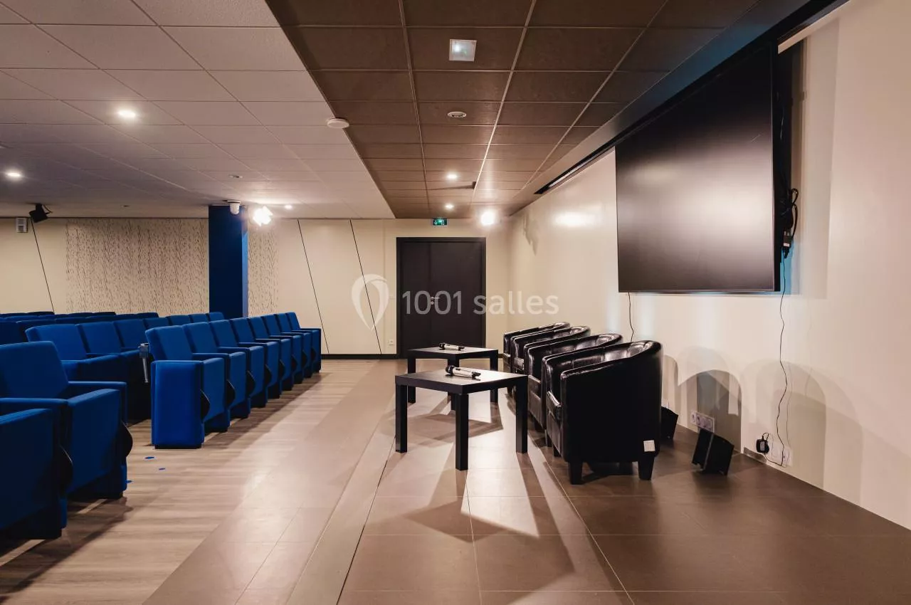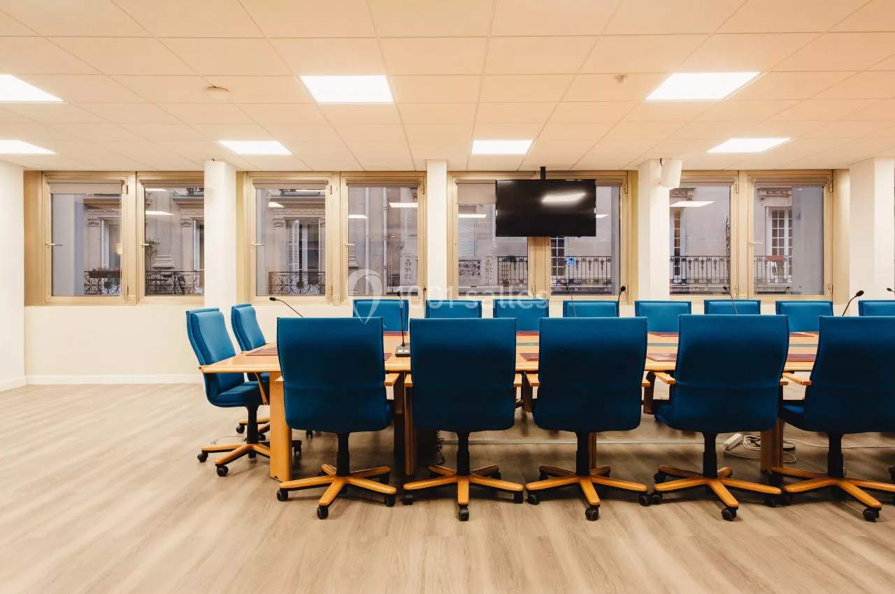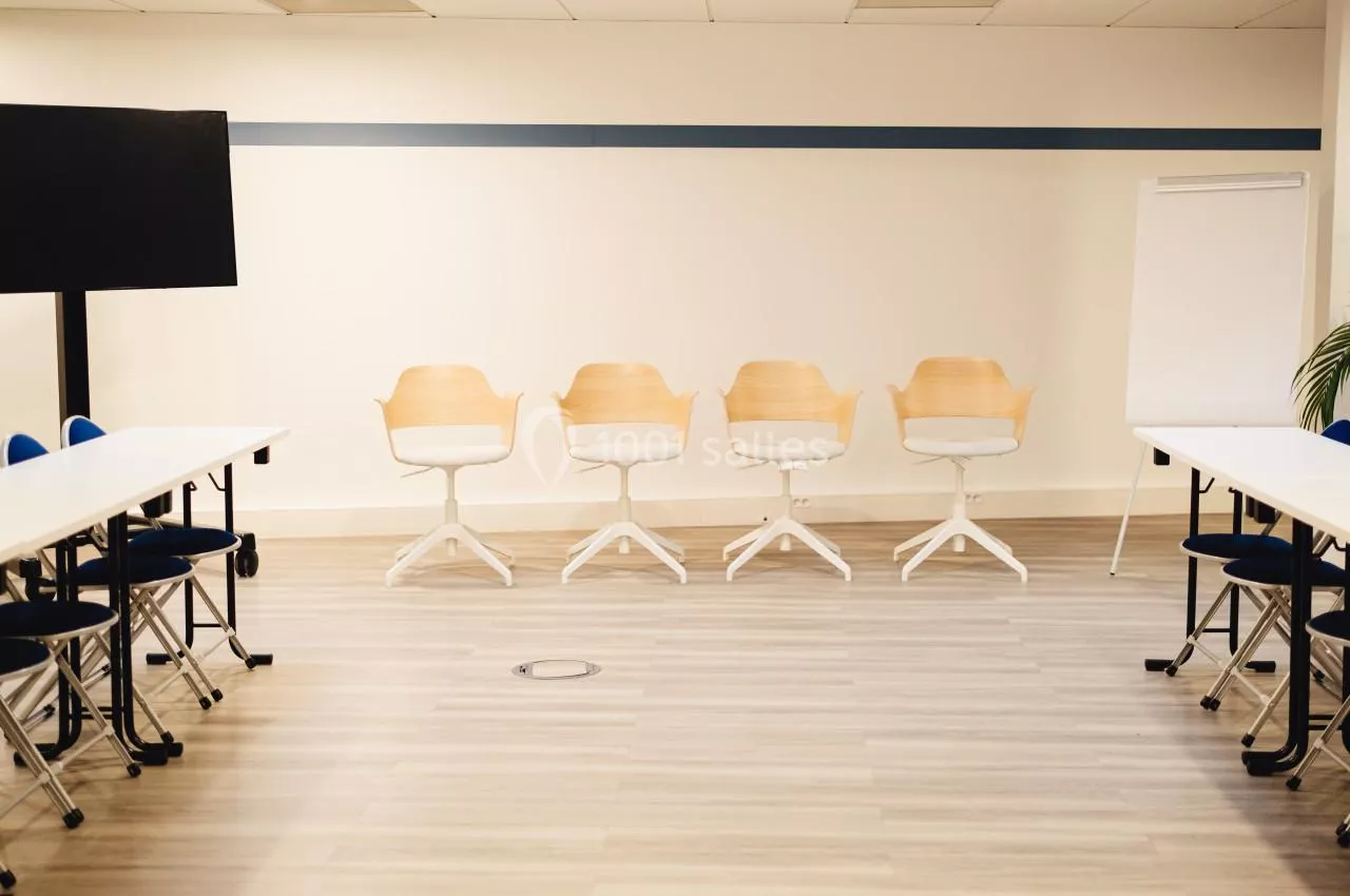 - Une grande salle de réunion de 30 places assises située au 3ème étage du bâtiment. Très lumineuse cette salle dispose de tout le matériel nécessaire au bon déroulement de votre réunion en présentiel ou a distanciel : visio conférence, vidéo projecteur, micro col de cygne.