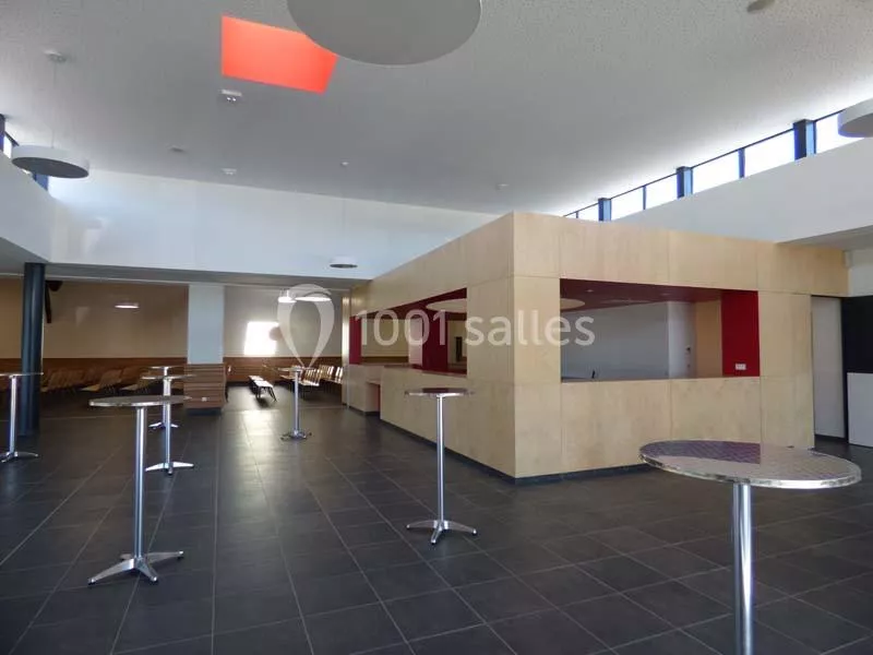 Hall d'exposition d'une superficie de 250 m² avec espace Bar lounge, office de réchauffage et plonge, idéal la partie réception : accueil café, banquets ou cocktails (Tables rectangulaires, rondes, mange-debout, chaises tout confort). Le hall d'expo s'ouvre en totalité sur la salle Dussud grâce à une paroi amovible.
