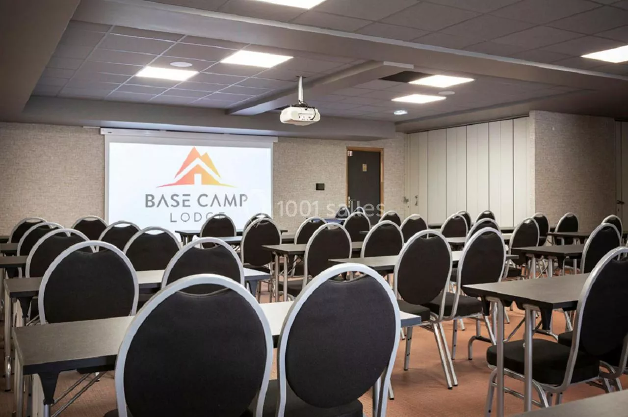 La capacité maximale en configuration conférence est de 200 personnes dans la salle Mont Blanc de l'Hotel Base Camp Lodge.
