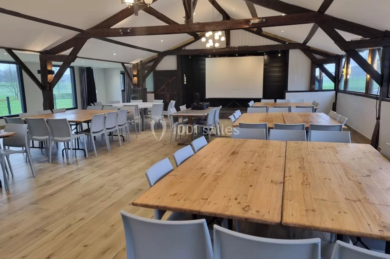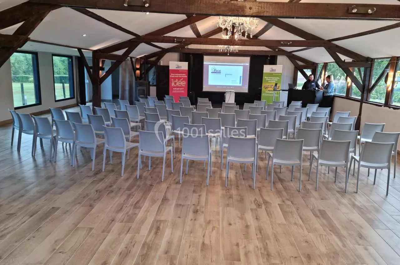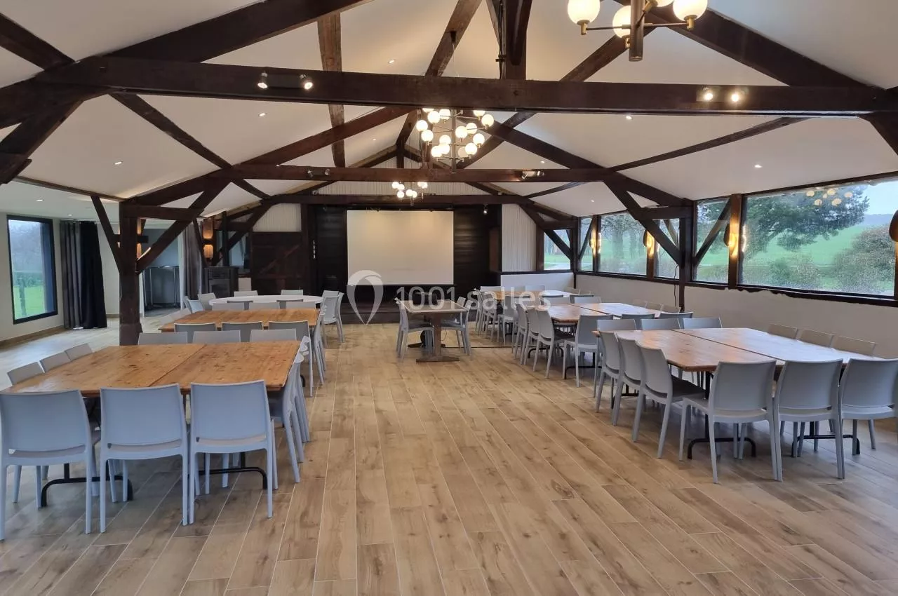 La salle Brocéliande au Domaine les Couettes est spacieuse avec une capacité de 120 personnes assises, idéale pour de grandes conférences ou réceptions, et elle est équipée d'une cuisine traiteur.