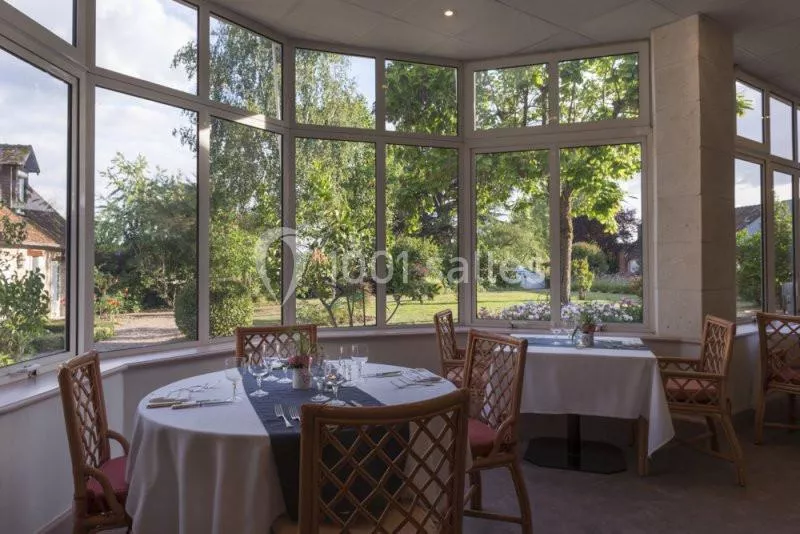 Notre restaurant vous propose 3 salles : une véranda donnant sur le jardin, une salle à manger traditionnelle avec poutres et une magnifique cheminée et un salon privatif décoré d'un trompe l'œil.