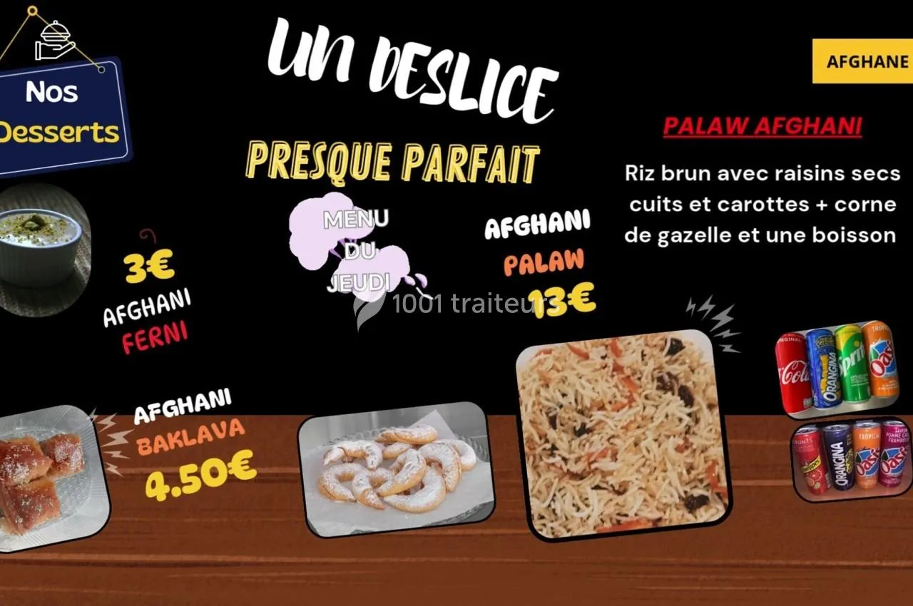 Découvrez notre menu aux saveurs d’Afghanistan, entre plats traditionnels, entrées croustillantes et desserts faits maison. De nombreux mets sont disponibles sur commande, et nous adapt...ons nos prestations selon vos besoins, vos envies et le type d’événement : mariages, anniversaires, entreprises ou associations.